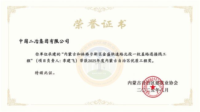 近日,中国二冶内蒙古分公司承建的内蒙古和林格尔新区金盛快速路北段-杭盖路连接线工程,荣获2025年度“内蒙古自治区优质工程奖”。